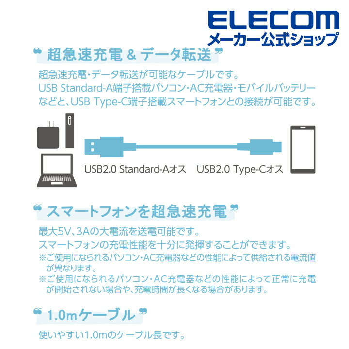 充電やデータ転送が可能なUSB2.0ケーブル USB Standard-Aを搭載しているパソコン及び充電器、モバイルバッテリーなどに、USB Type-Cを搭載しているスマートフォンやタブレットを接続し、充電やデータ転送が可能なUSB2.0ケーブルです。
